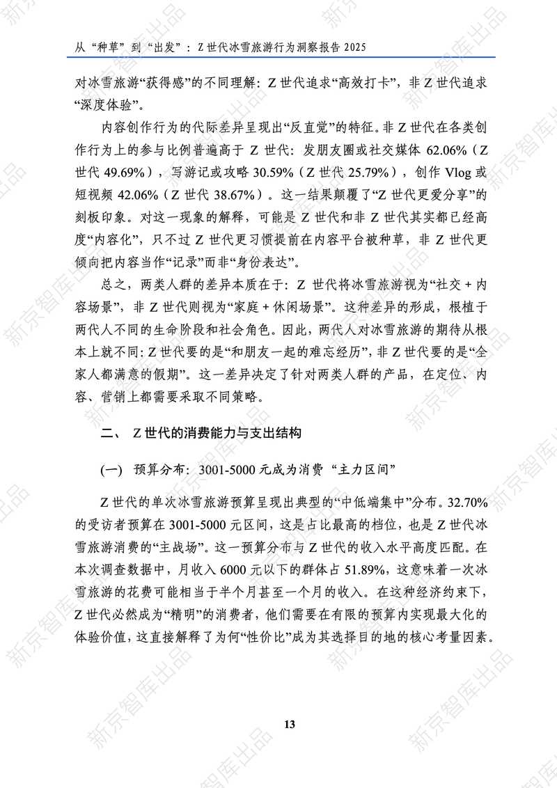 3001元-5000元是Z世代冰雪消費的“主戰(zhàn)場”:中等預算區(qū)間高度集中,表明冰雪旅游正在從小眾高端運動向大眾休閑消費轉型。