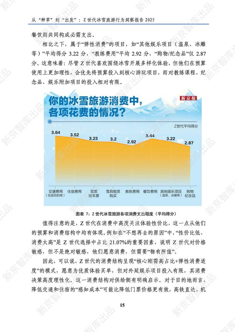 Z世代消費結構呈“剛性支出優(yōu)先、彈性消費克制”特征:交通住宿是首要支出項,教練服務、裝備購買等彈性消費相對克制,體現(xiàn)出精打細算的消費理性。