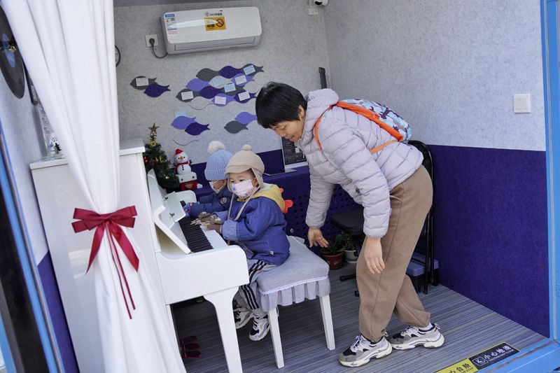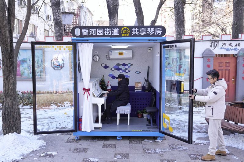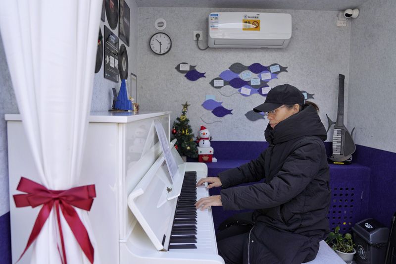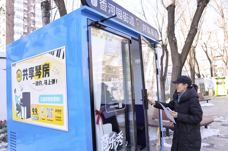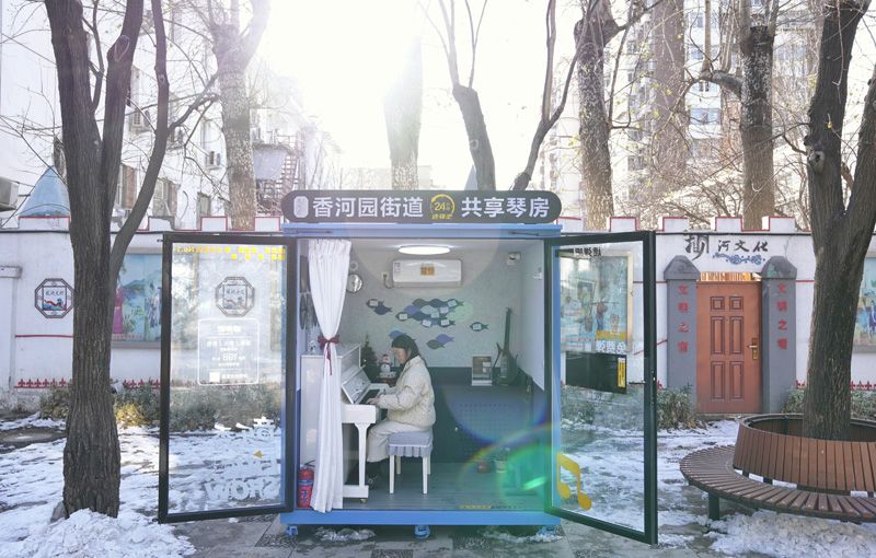 12月17日,朝陽區(qū)香河園街道西壩河中里社區(qū),一位居民正在“共享琴房”練琴。近日,這個“共享琴房”完成煥新升級,新升級的琴房可切換為小型表演舞臺,還新增了AI輔助練琴、賽博吉他等設(shè)備,為各類樂器愛好者打造更全能的練樂空間。
