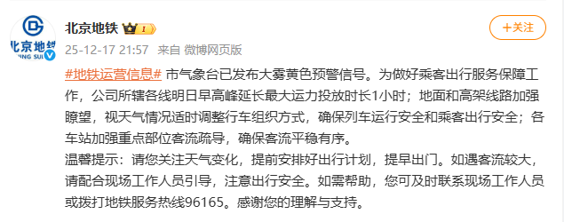 新京報(bào)訊 據(jù)@北京地鐵 微博消息,市氣象臺(tái)已發(fā)布大霧黃色預(yù)警信號(hào)。為做好乘客出行服務(wù)保障工作,公司所轄各線明日早高峰延長最大運(yùn)力投放時(shí)長1小時(shí);地面和高架線路加強(qiáng)瞭望,視天氣情況適時(shí)調(diào)整行車組織方式,確保列車運(yùn)行安全和乘客出行安全;各車站加強(qiáng)重點(diǎn)部位客流疏導(dǎo),確??土髌椒€(wěn)有序。