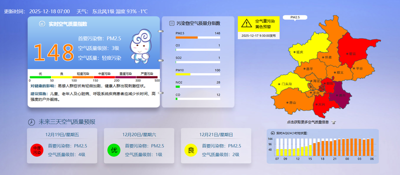 據(jù)北京市生態(tài)環(huán)境監(jiān)測(cè)中心今早7時(shí)數(shù)據(jù),目前實(shí)時(shí)空氣質(zhì)量指數(shù)148,空氣質(zhì)量為輕度污染。