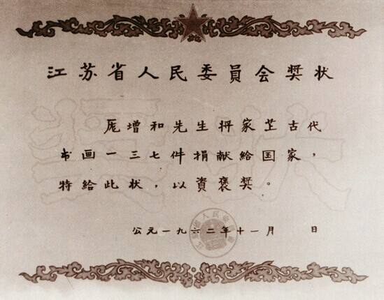 1962年,江蘇省人民委員會(huì)頒發(fā)給龐增和捐贈(zèng)古代書畫137件的獎(jiǎng)狀。