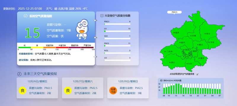 據(jù)北京市生態(tài)環(huán)境監(jiān)測中心今早7時數(shù)據(jù),目前實時空氣質量指數(shù)15,空氣質量優(yōu)。