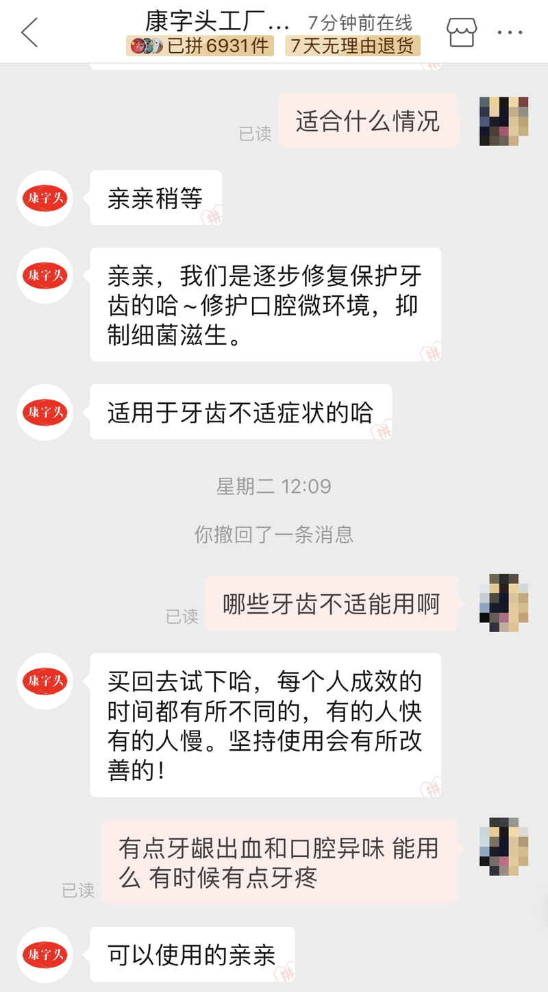 店鋪客服的說(shuō)法也沒(méi)有改變。在前述報(bào)道中,店鋪客服稱產(chǎn)品為“逐步修復(fù)保護(hù)牙齒,修護(hù)口腔微環(huán)境,抑制細(xì)菌滋生”,并表示記者咨詢的牙齦出血、牙齦腫均可使用。近日,記者再次就產(chǎn)品適用情況進(jìn)行咨詢,客服依然給出了同樣的答復(fù),記者進(jìn)一步咨詢牙齦出血、口腔異味、牙疼是否適用,客服給出了確定的答復(fù)。