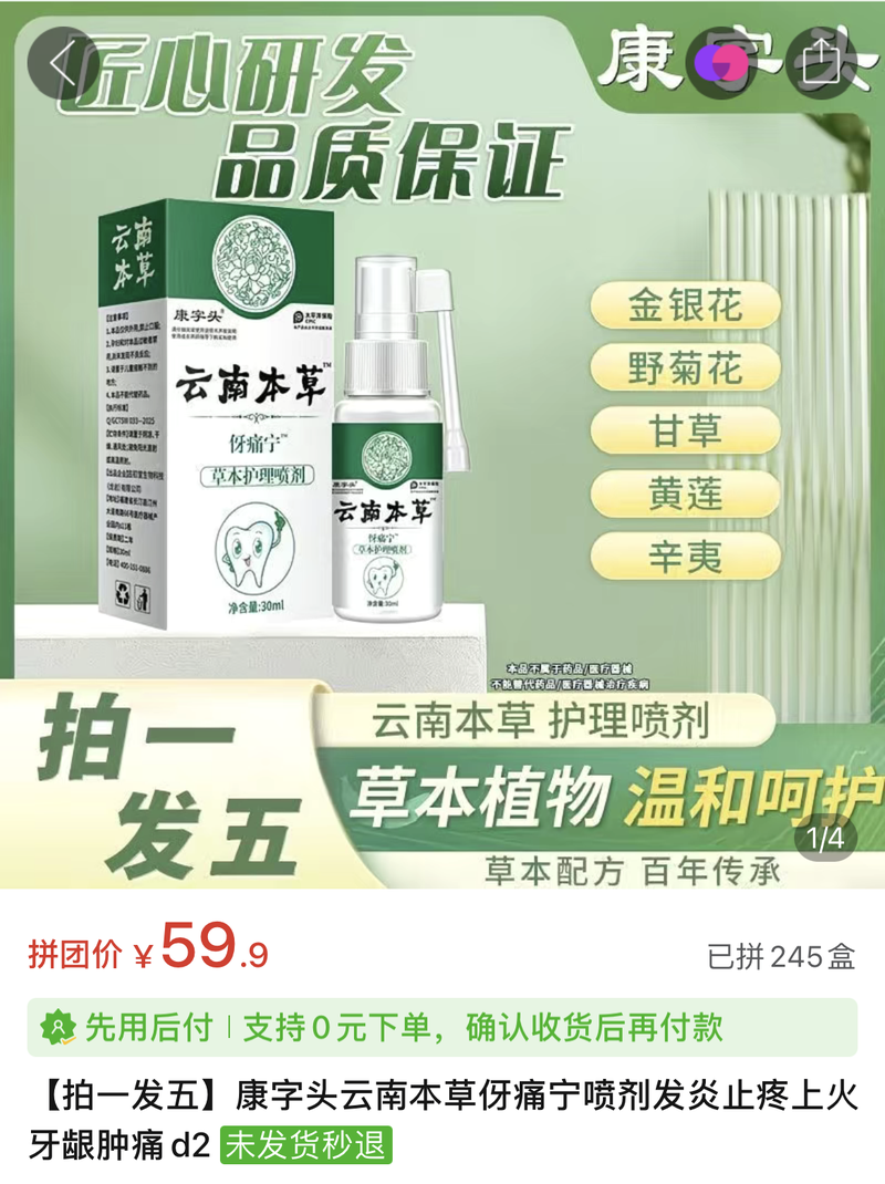 目前,這款“康字頭云南本草伢痛寧草本護(hù)理噴劑”的售價(jià)沒(méi)有變化,五瓶裝售價(jià)仍為59.9元。在店鋪的產(chǎn)品介紹中,之前宣稱能夠治療各種牙痛的視頻已經(jīng)下架。此前在該視頻中,提及產(chǎn)品“治多種牙痛問(wèn)題:吃飯牙痛、喝水牙痛、蟲牙蛀牙、吃涼牙痛、牙齦腫痛、牙周炎痛”“我們比牙醫(yī)更加快捷更加方便,適合隨身便攜、病發(fā)即止”,并稱該產(chǎn)品能夠“從源頭解決牙痛問(wèn)題”。