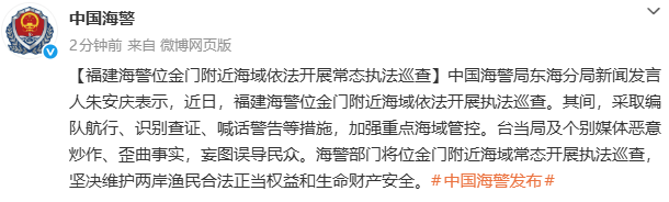 新京報(bào)訊 據(jù)中國(guó)海警官博消息,中國(guó)海警局東海分局新聞發(fā)言人朱安慶表示,近日,福建海警位金門附近海域依法開(kāi)展執(zhí)法巡查。其間,采取編隊(duì)航行、識(shí)別查證、喊話警告等措施,加強(qiáng)重點(diǎn)海域管控。臺(tái)當(dāng)局及個(gè)別媒體惡意炒作、歪曲事實(shí),妄圖誤導(dǎo)民眾。海警部門將位金門附近海域常態(tài)開(kāi)展執(zhí)法巡查,堅(jiān)決維護(hù)兩岸漁民合法正當(dāng)權(quán)益和生命財(cái)產(chǎn)安全。